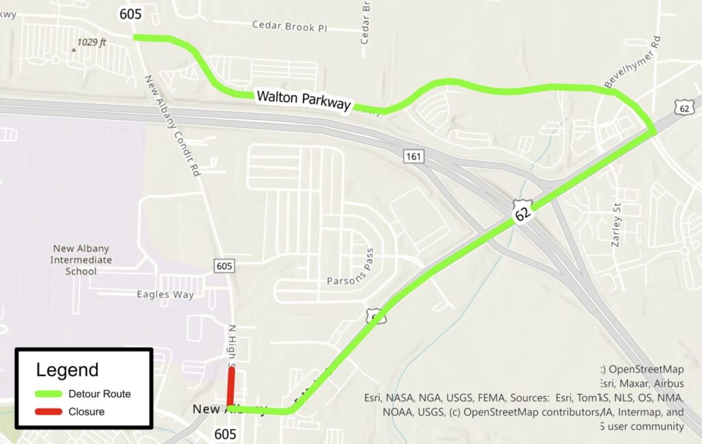 As part of the project, crews will be working to tap the water main on SR-605. This work will require nightly closures of SR-605 between 7:00 p.m. and 6:00 a.m. beginning Sunday, September 14, and continuing through Friday, September 19. The closures will take place only during overnight hours, and daytime traffic—including New Albany-Plain Local Schools bussing—will not be affected. Please plan to use the detour below.